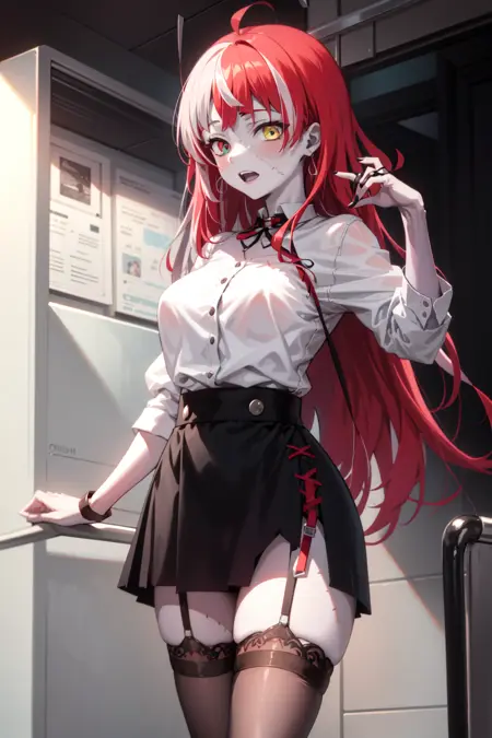 샐리의 경우 isekaisallie와 검은 치마, 브라, 검은 허벅지 양말, 긴 머리 등을 포함하세요.