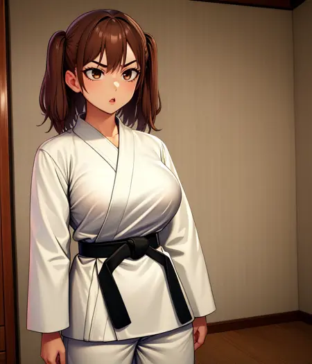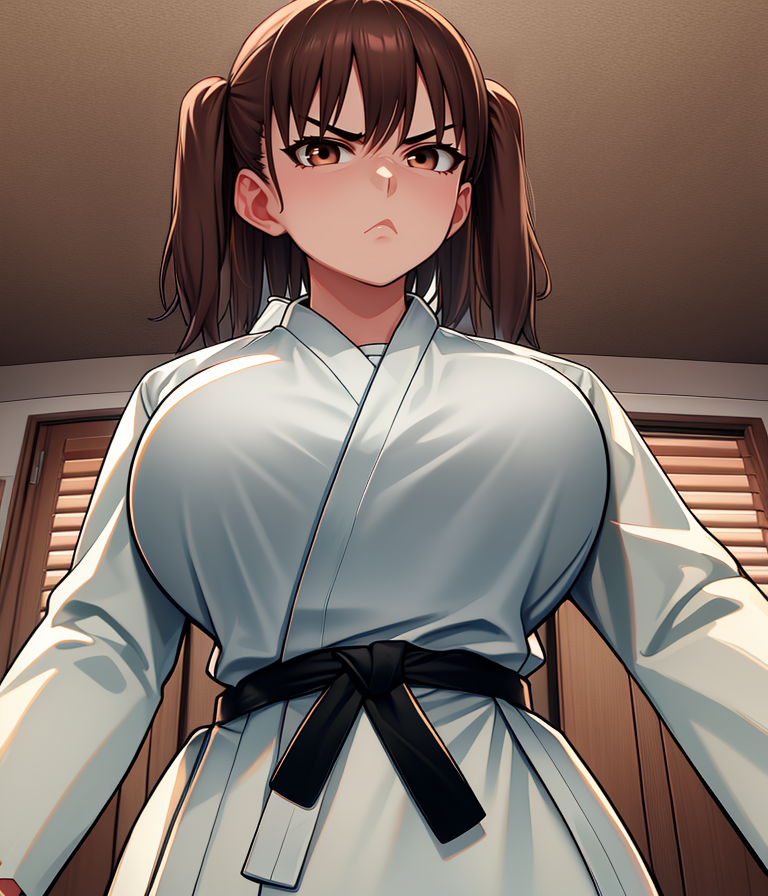 道着、または白い道着、黒帯、または学校制服、スカート、