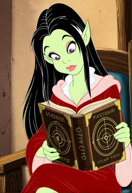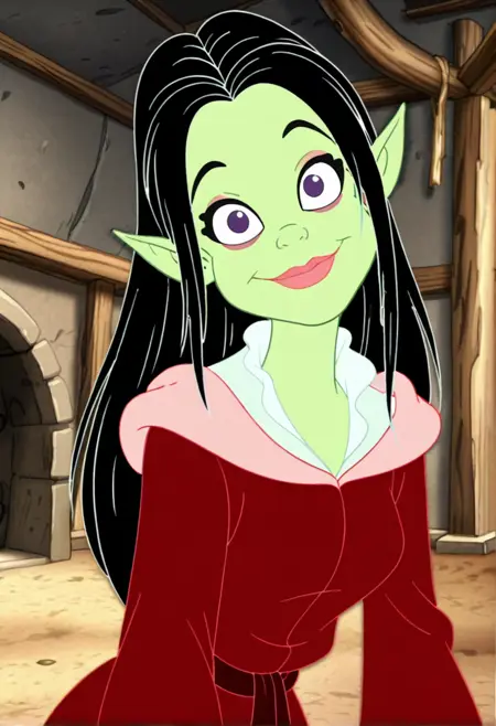 Trigger = tjald, Tags = 1girl, solo, black hair, long hair, lipstick, colored skin, green skin, purple eyes, red robe, pointy ears