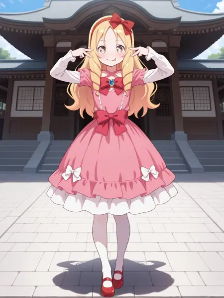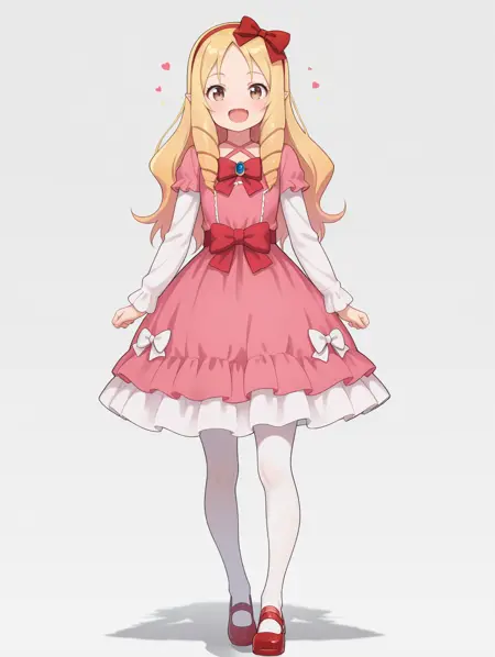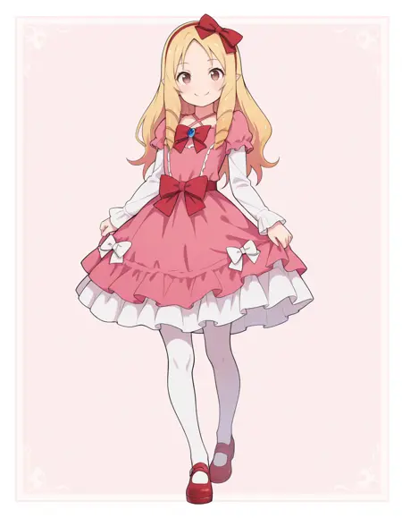 With outfit prompts: YamadaElf, long hair, hair bow, drill hair, dress, bow, blonde hair, red bow, pink dress, hairband, twin drills, brown eyes, long sleeves, pointy ears, lolita fashion, white bow, white pantyhose, red footwear, mary janes, shoes,