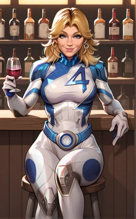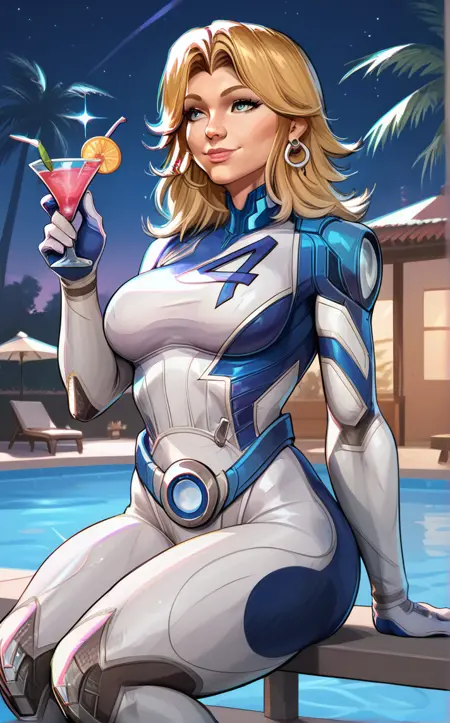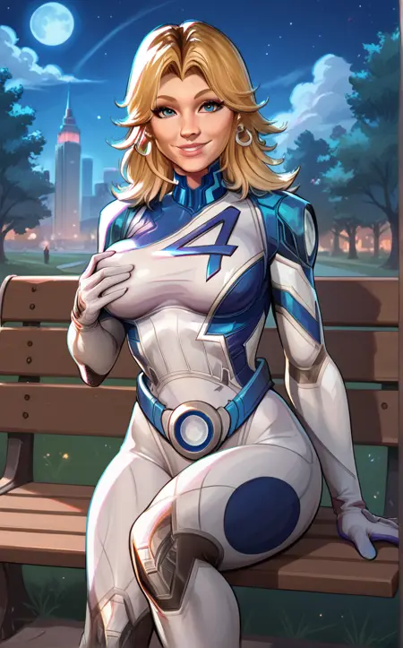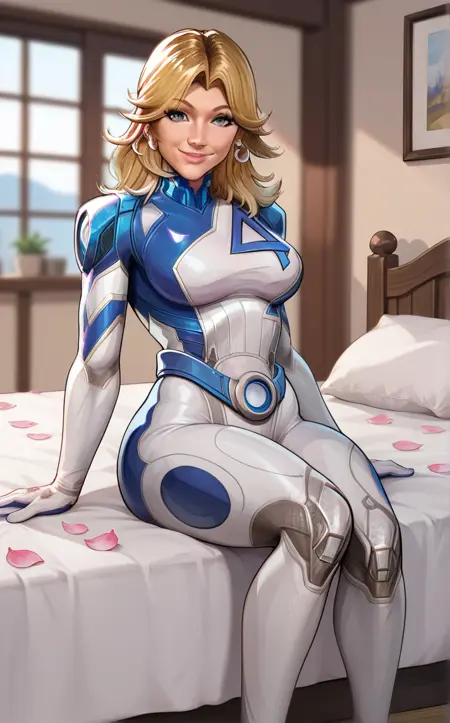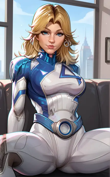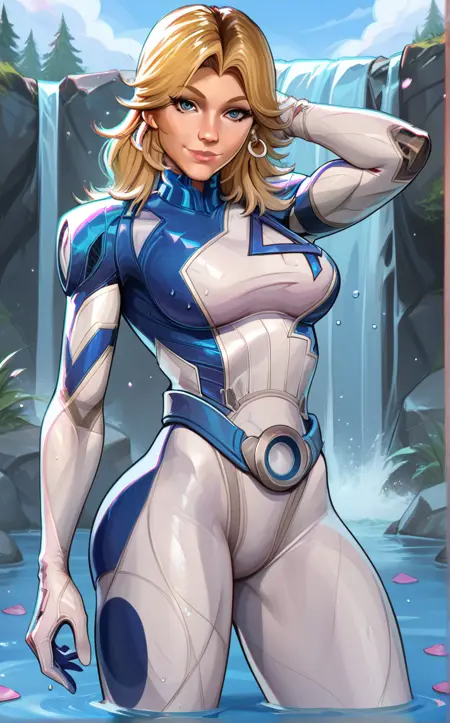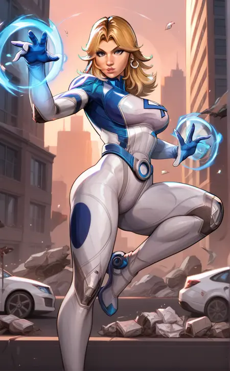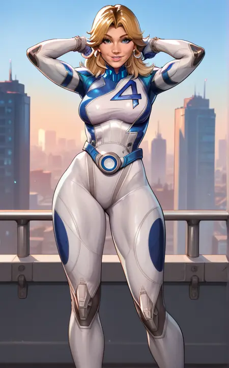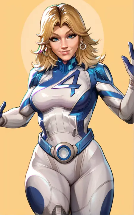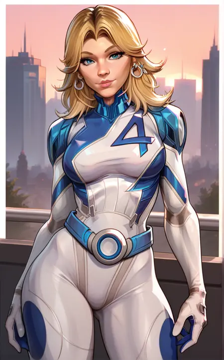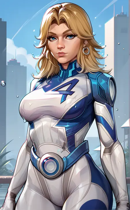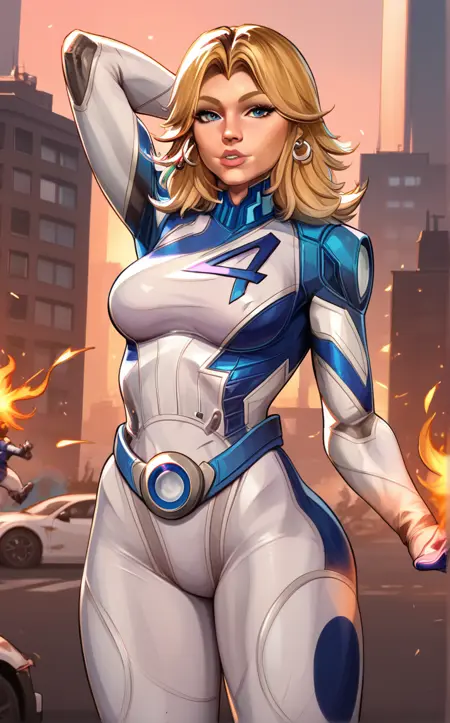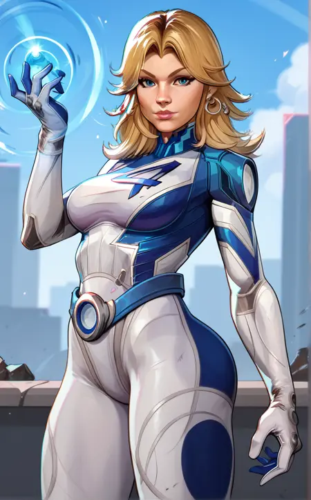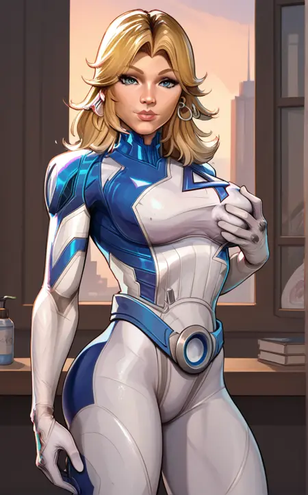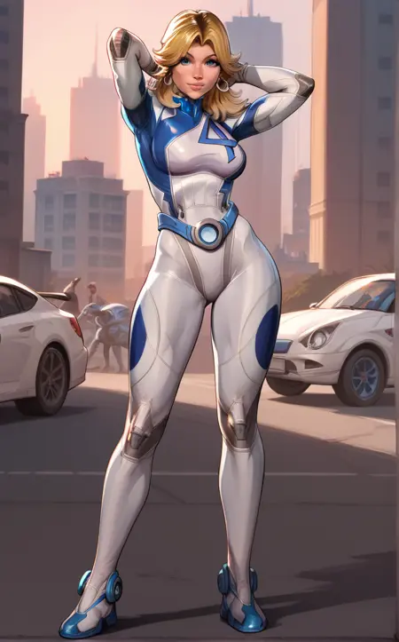 PONYXL_MarvelRivalsSueStorm_ownwaifu, 1girl, blue belt, blue bodysuit, flipped hair, long legs, narrow waist, number print, skin tight, toned, two-tone bodysuit, white bodysuit, blonde hair, blue eyes, lips, long hair, jewelry, medium breasts, hoop earrings, nose, gloves, large breasts, superhero, earrings, blue gloves, parted bangs, multicolored clothes, bangs, pilot suit, white gloves, multicolored bodysuit, shiny hair, pink lips, thick eyebrows, thick thighs, turtleneck, covered abs,