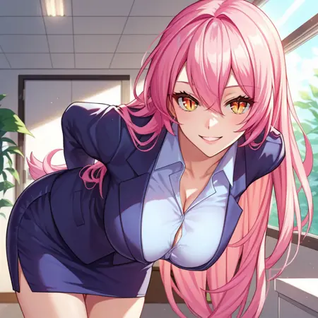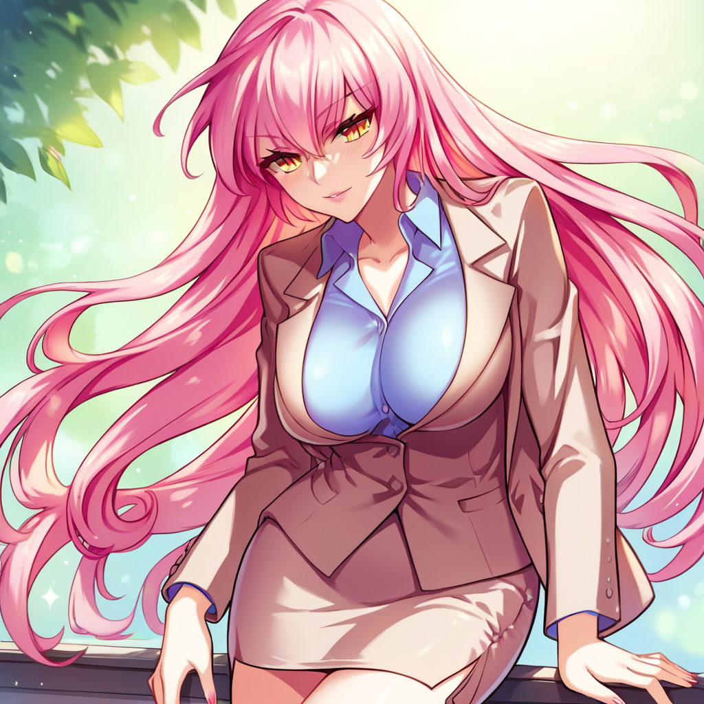 Fiona,1girl, breasts, solo, long hair, large breasts, pink hair, yellow eyes ,slit pupils