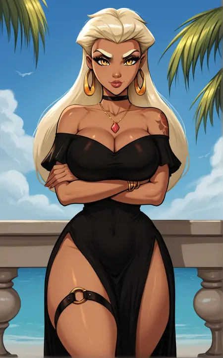 BlackDress_QueenLa_ownwaifu, 1girl, bare shoulders, blonde hair, dark skin, dark-skinned female, eyeliner, gold, hair slicked back, jewelry, lipstick, long hair, makeup, nose, red lips, slit pupils, white hair, yellow eyes, black choker, black dress, bracelet, cleavage, curvy, eyeshadow, hoop earrings, impossible dress, large breasts, lips, mature female, narrow waist, necklace, off shoulder, off-shoulder dress, pendant, tattoo, thick eyebrows, wide hips, brown lips, gem, shoulder tattoo, side slit, thick thighs, thigh strap,