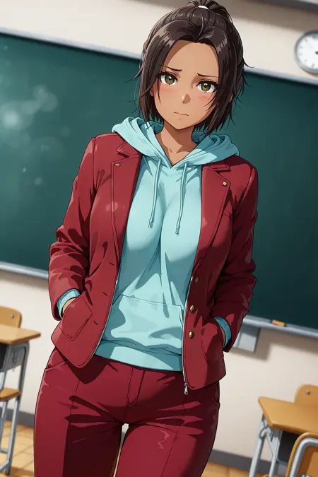 (long_sleeves,open-jacket,open_clothes,hood,open_jacket,hoodie,hood_down,red_jacket,(red_pants)),tanned_marks,