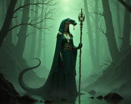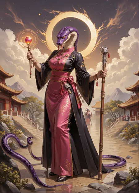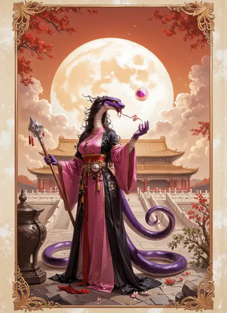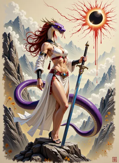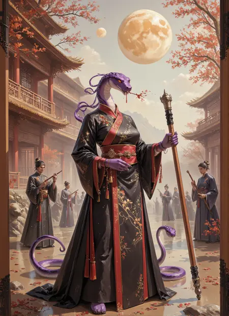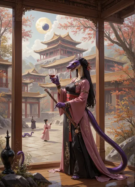 ** Forgotten Realms のユアン・ティ(蛇人)種族を、中国の工筆画スタイルの墨と水彩画で描いた作品。北京の紫禁城や万里の長城などの中国の地を学習データとして使用。**