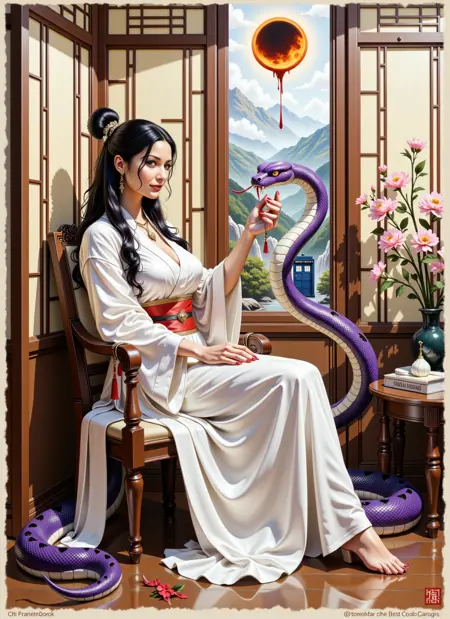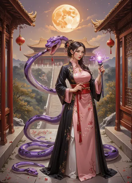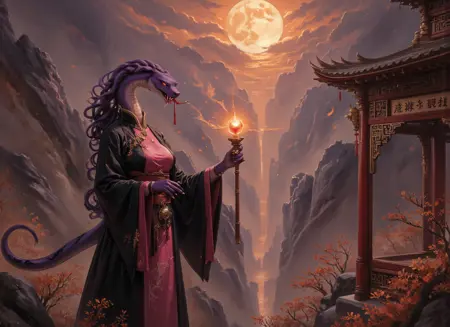 중국 공비 미술 스타일의 먹과 수채화 작품으로, 잊혀진 실체의 원티(뱀 인간) 종족을 묘사합니다. 중국의 자금성과 만리장성을 모델로 학습되었습니다.