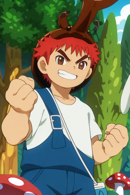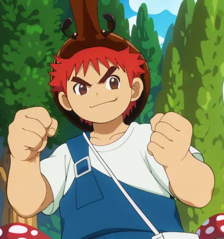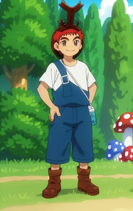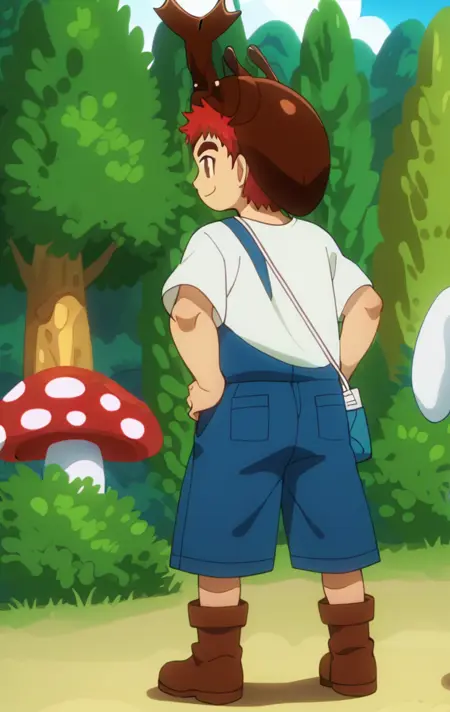 提示:男性,健壮,红发,棕色眼睛,浓眉,甲虫帽,白色T恤,蓝色工装裤,包(用于捕虫),棕色靴子,蝴蝶网,室内(实验室),室外(自然/森林/蘑菇)