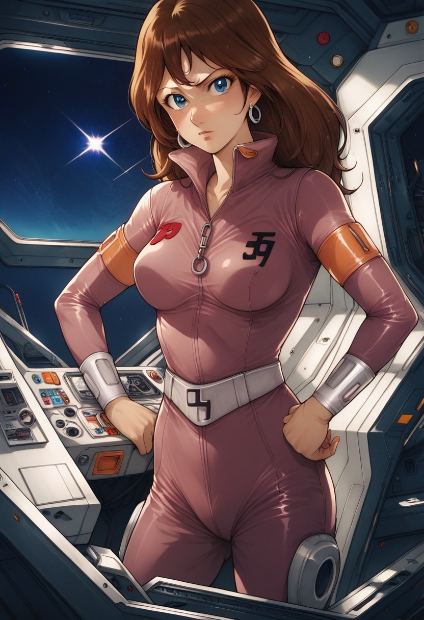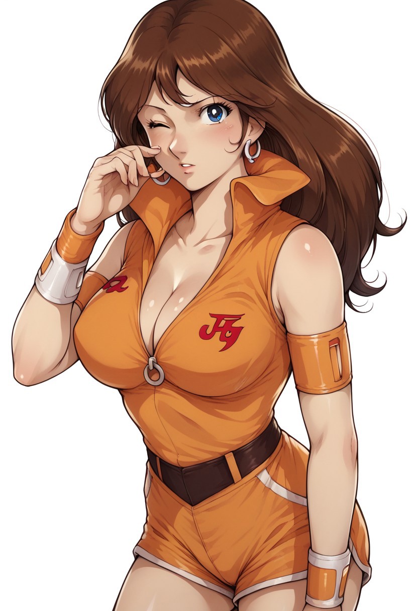프롬프트: galaxy cyclone braiger, machiko valencia, 1girl, solo, breasts, cleavage, brown hair, large breasts, jewelry, earrings, long hair, retro artstyle, shorts, 1980s (style), blue eyes, wristband, armband, orange shirt, sleeveless, orange skirt