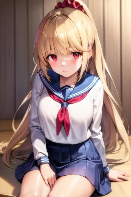 Default outfit: blue skirt yellow shirt serafuku pink wrist scrunchie