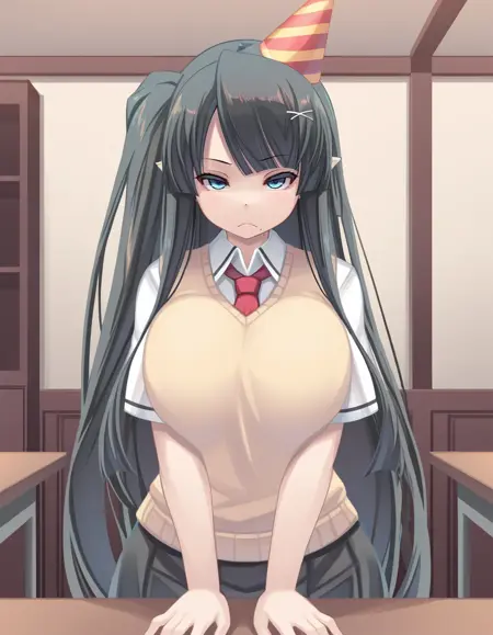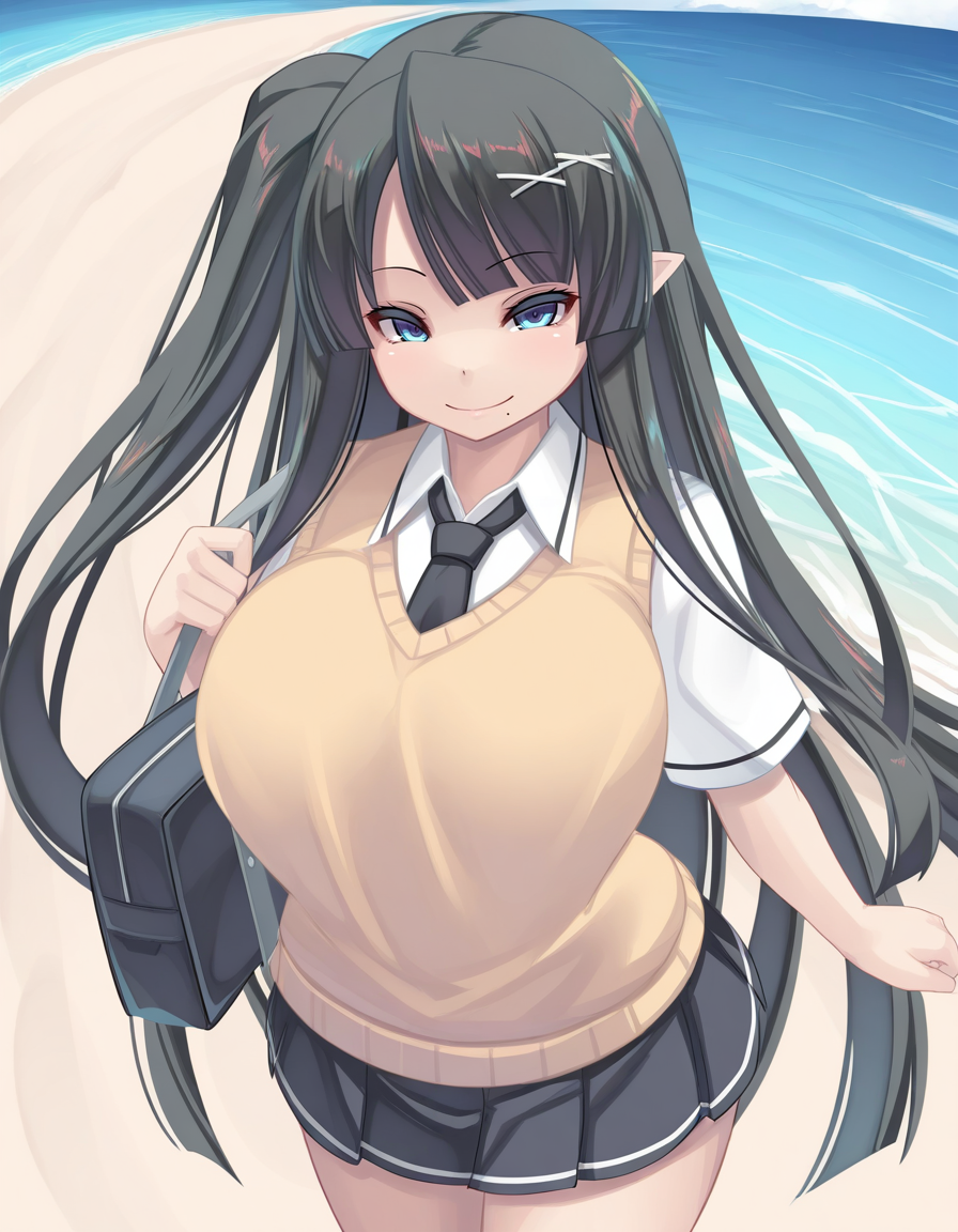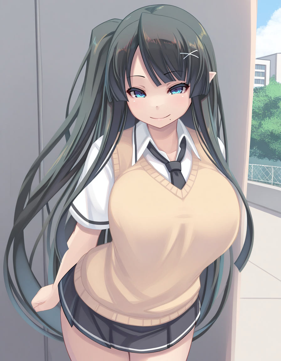 일반 형태: myusca, noryusca, 입 밑 점, 긴 머리, 검은 머리, 치마, 뾰족한 귀, 교복, 점, 머리 장신구, 큰 가슴, 넥타이, 스웨터 조끼, 파란 눈