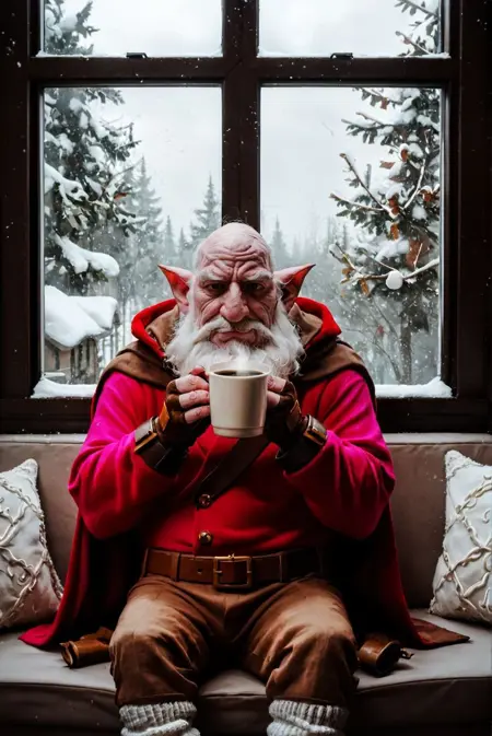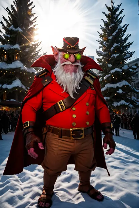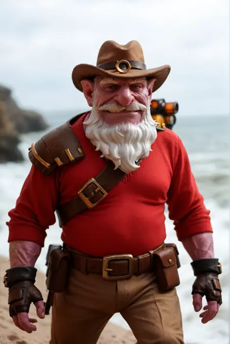belt, brown gloves, brown belt, brown pants,fingerless gloves,brown headwear, red sweater.