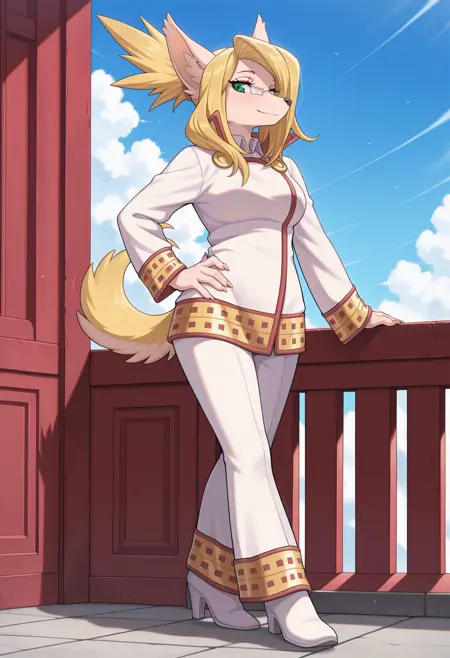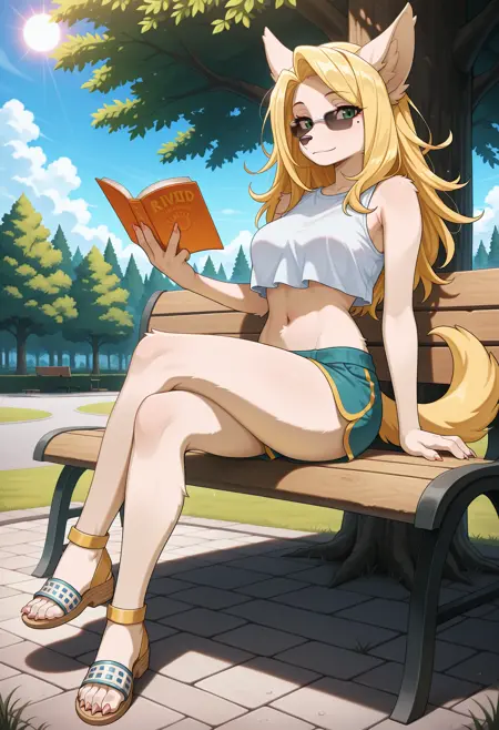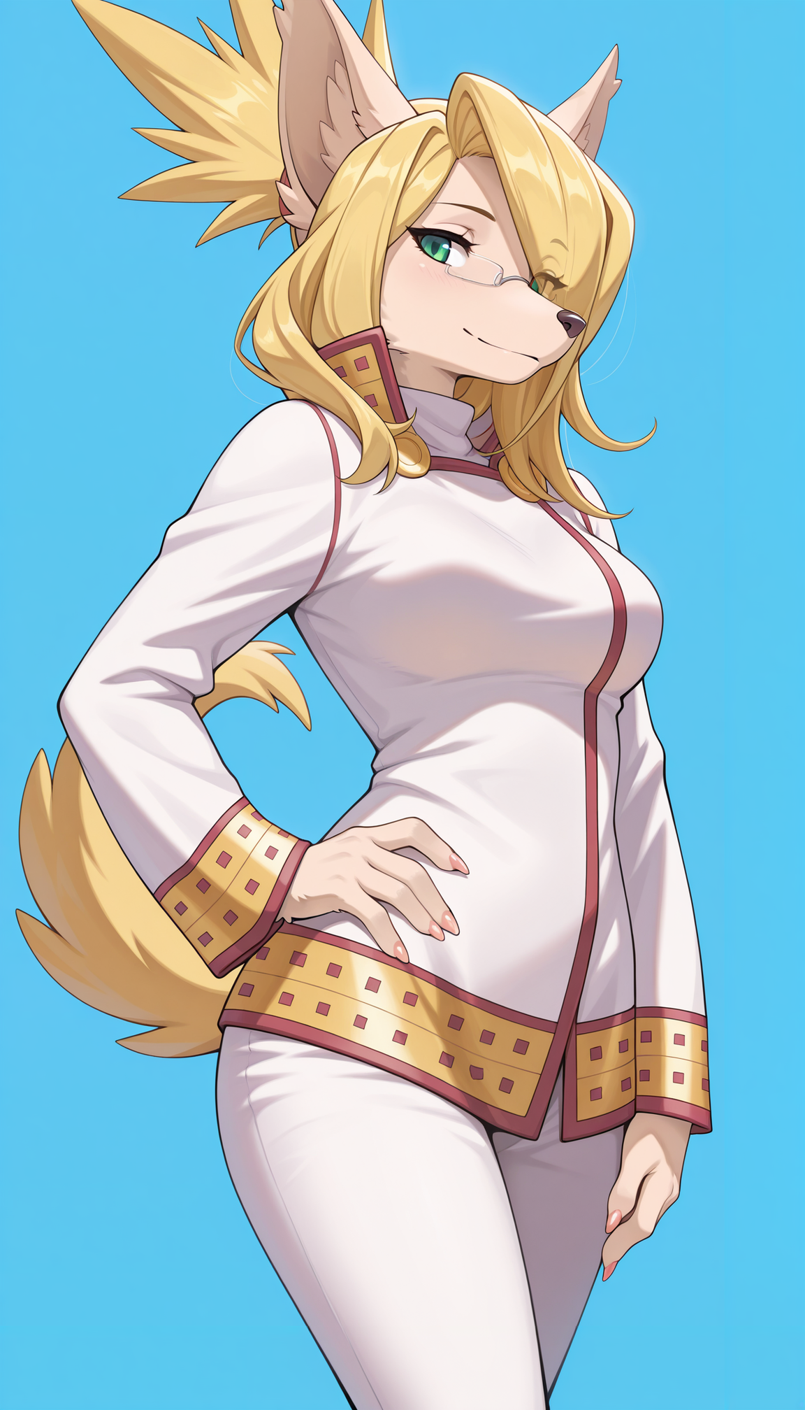 유용한 태그: 강아지 소녀, 퓨리 여성, 초록색 눈, 동물 귀, 동물 코, 꼬리, 금발 머리, 폰테일
