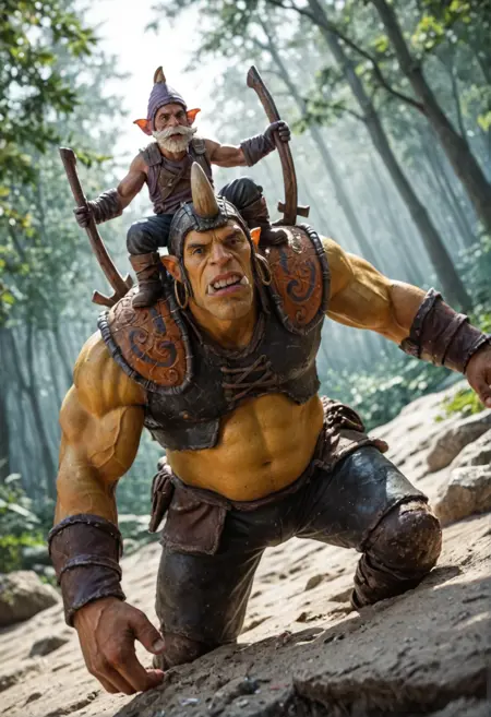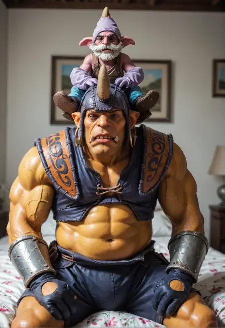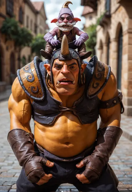 brown footwear, armor, gloves, hat, helmet, pants, torn clothes