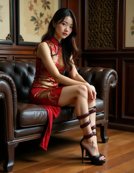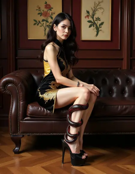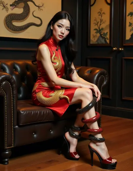 wearing striking high-heeled shoes. Heelssss, The legs are fair-skinned. The most notable feature of the shoes is that they are adorned with a pair of large, black and red snakes, one on each leg, that wrap around the ankles, calves and thighs and coiled high-up all the way up her legs and body. The snakes are realistic-looking and appear to be made of a soft, textured material that mimics the scales of real snakes. The snakes' heads are positioned at the ankles, giving the impression that they are coiled around the legs. The shoes are platform black high-heeled mules and have a peep-toe design, with a platform sole and a thin stiletto heel that adds height and a dramatic effect.