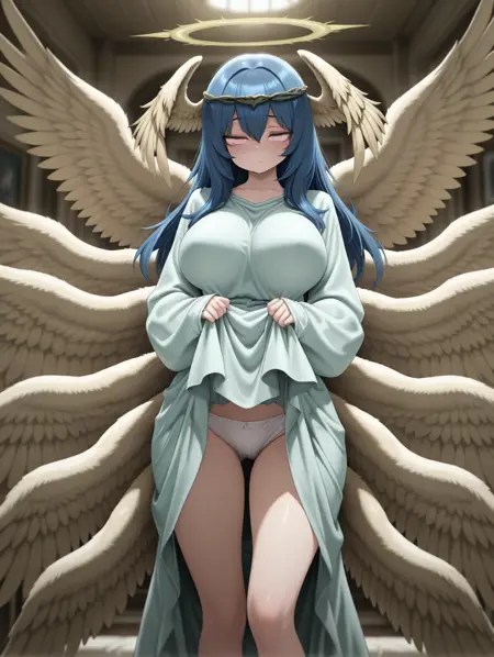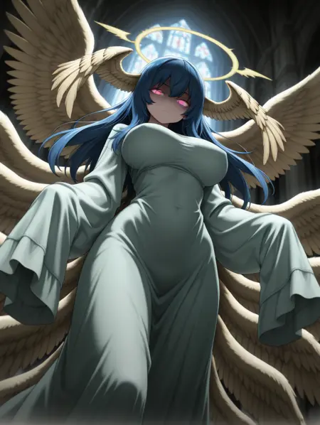 Ranael, 파란색 머리, 긴 머리, 분홍색 눈, 머리 날개, 환상, 여러 개의 날개, 여섯 개의 날개, 머리 장신구, 큰 가슴, 손목을 넘는 소매, 긴 드레스,