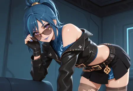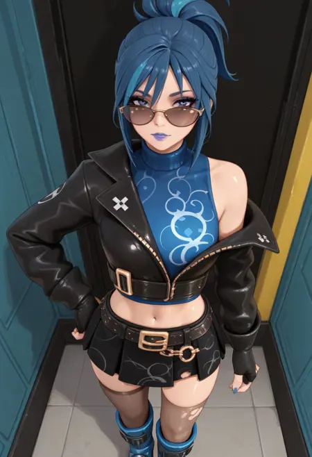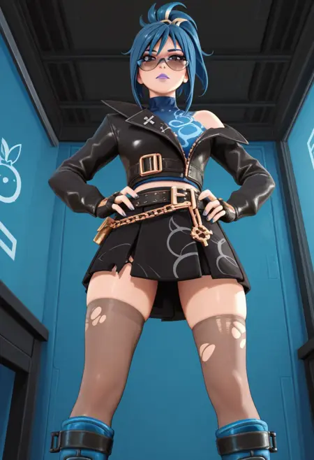 露肩, 无指手套, 黑色短裙, 黑色夹克, 腰带, 过膝袜, 破损衣物, 皮夹克, 长袖, 短款夹克, 靴子, 不对称裤装, 蓝色鞋履,