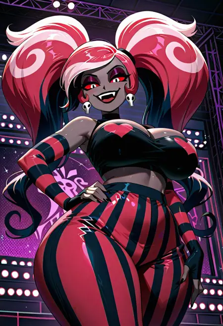 Red Hair, Pink Hair, Black Hair, Multicolored Hair, Long Hair, Twintails, Red Eyes, Colored Sclera, Eyeshadow, Dark Skin, Dark-Skinned Female, Colored Skin, Fangs, Skull Hair Ornament, Makeup, Earrings, Heart, Striped, Jewelry, Detached Sleeves, Striped Sleeves, Fingerless Gloves, Crop Top, Midriff, Pants, Striped Pants, Standard Outfit