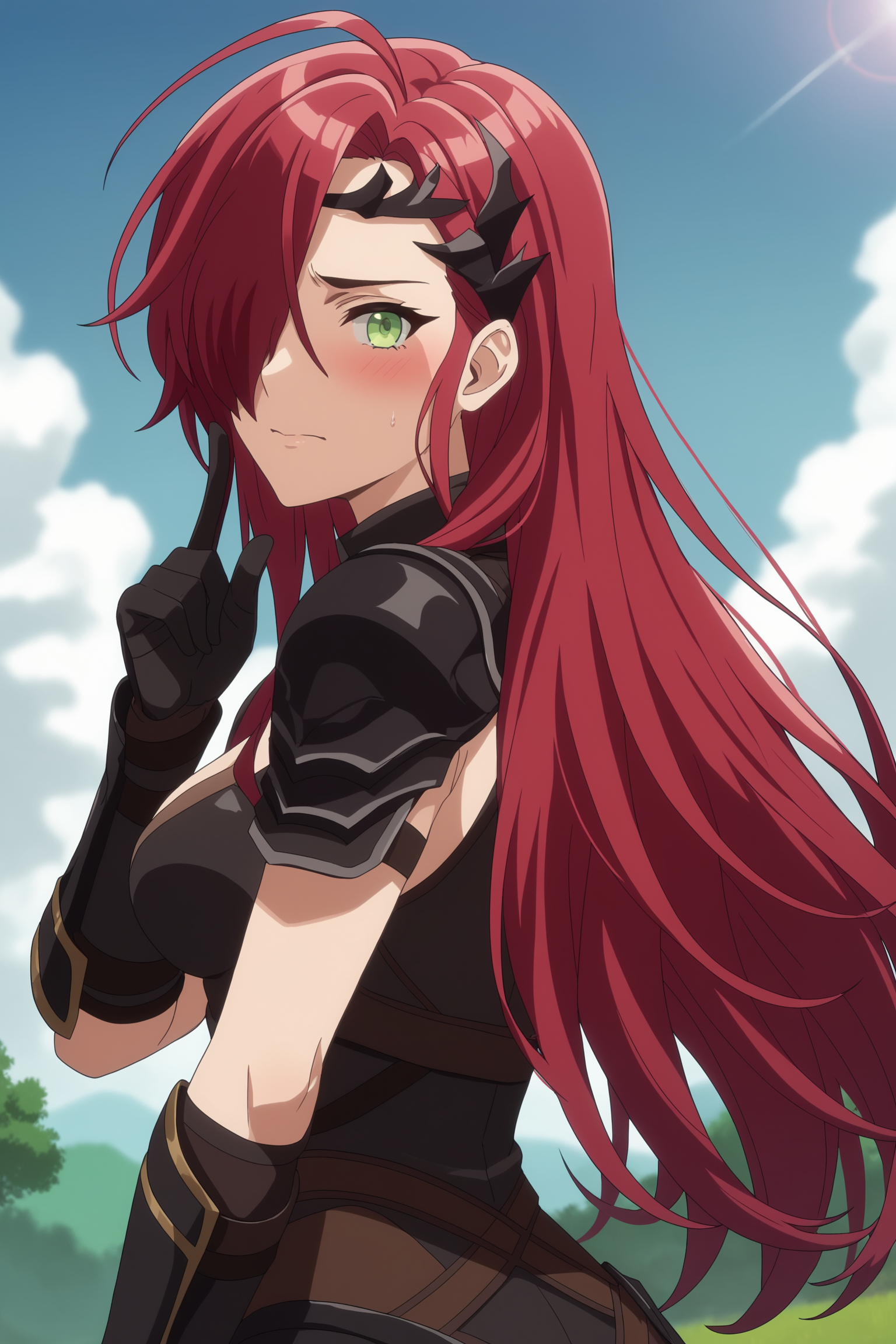 1girl, solo, long hair, green eyes, red hair, hair over one eye, sistia_rogue