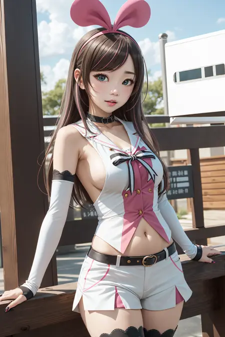 For an example of something close to the Default Outfit: shorts, hairband, navel, white shorts, short shorts, sideboob, bow, collarbone, detached sleeves, sailor collar, sleeveless, standing, thighhighs, shirt, arm warmers, sleeveless shirt, nail polish, ribbon, bare shoulders