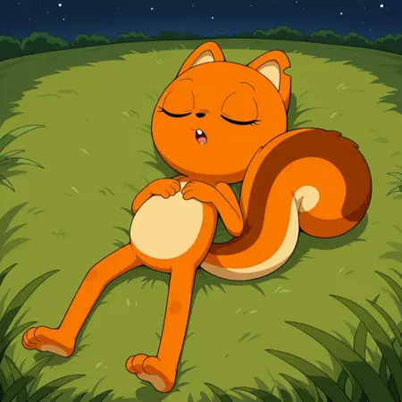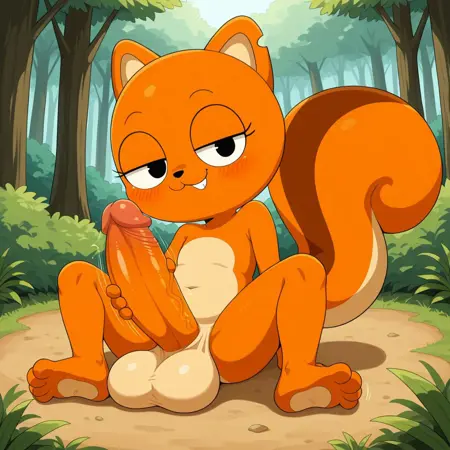 rodent, squirrel, orange fur, tan belly, puffy tail, two-toned tail, black eyes, black nose, bucktooth,