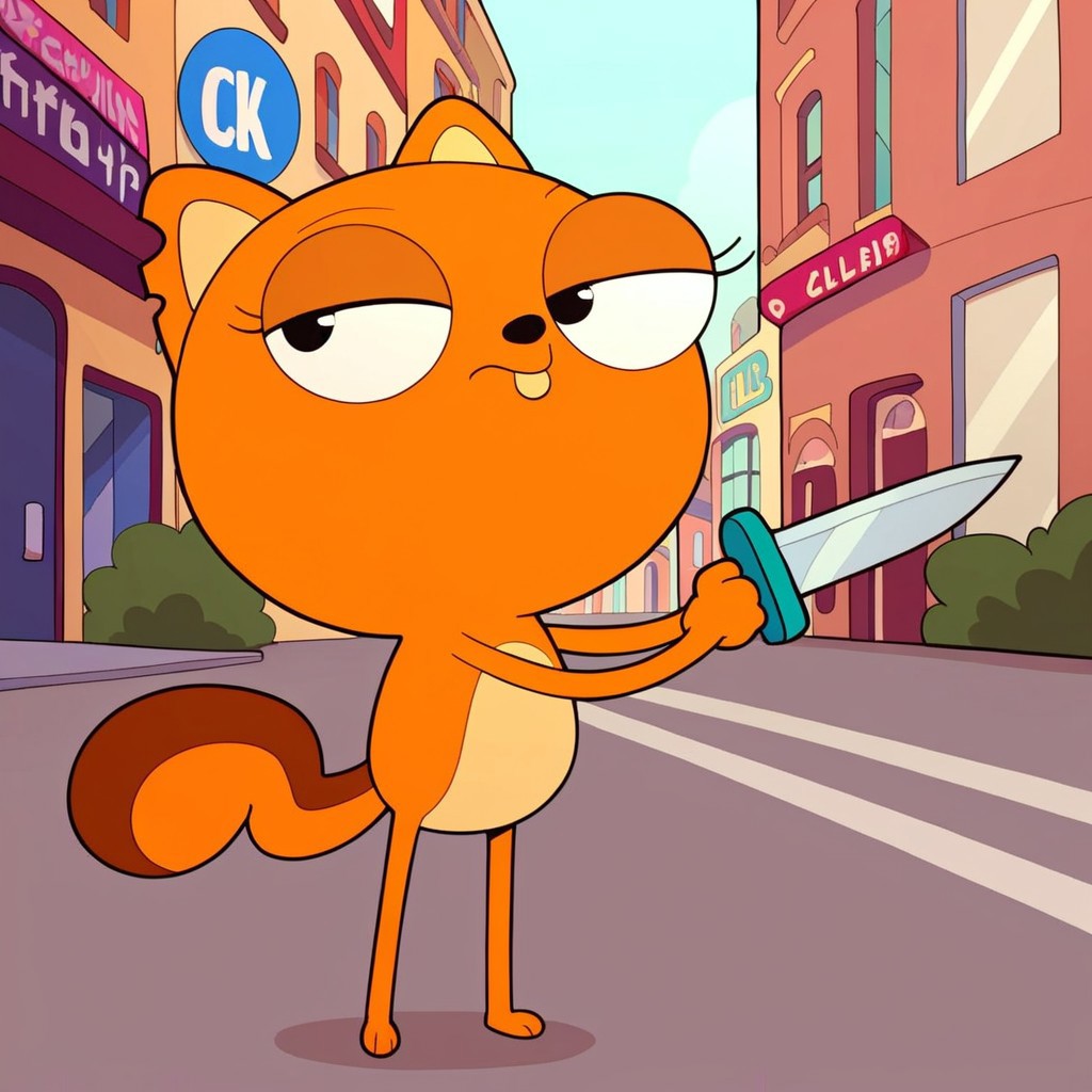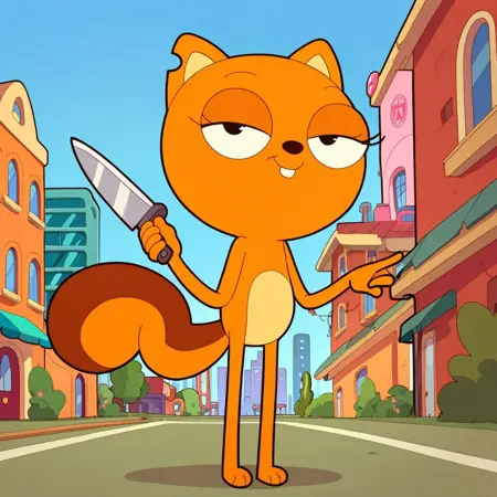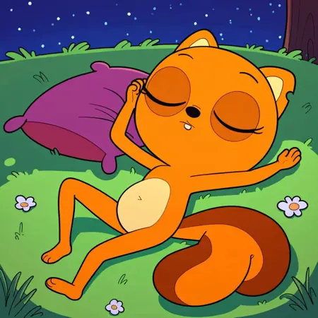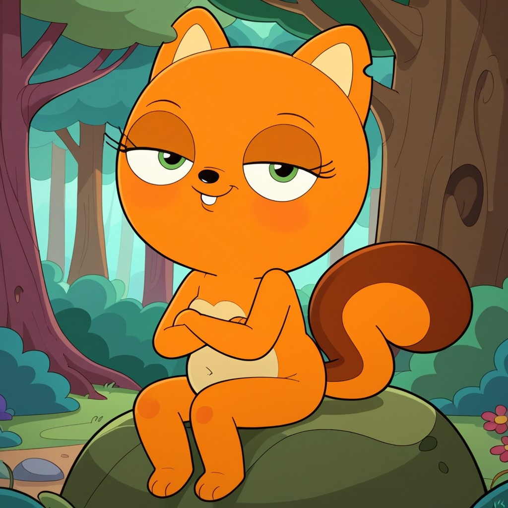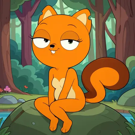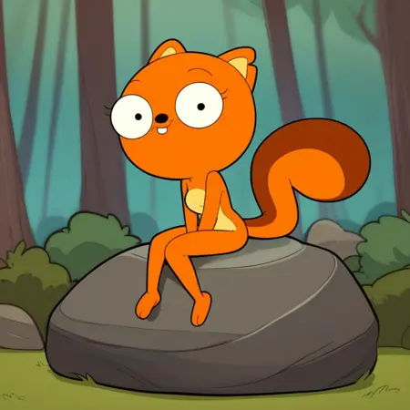 Squirrel, orange fur, tan belly, two-toned tail, black eyes, bucktooth,