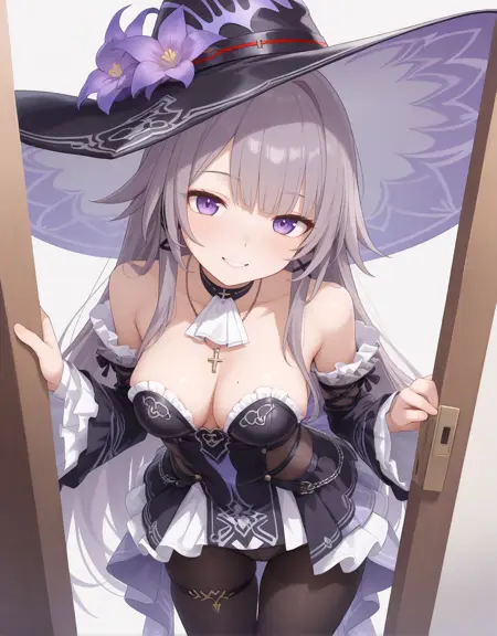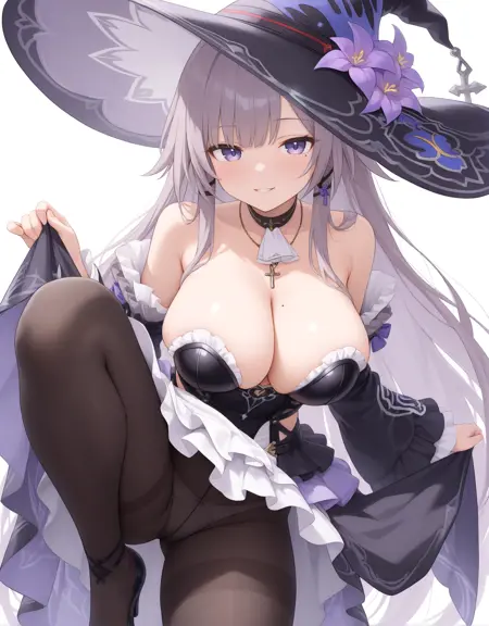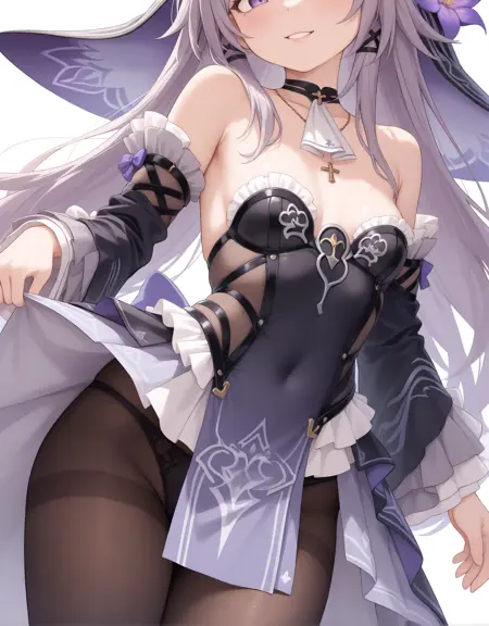 solo, bangs, long sleeves, dress, cleavage, bare shoulders, medium breasts, pantyhose, multicolored hair, frills, detached sleeves, black dress, black pantyhose, black headwear