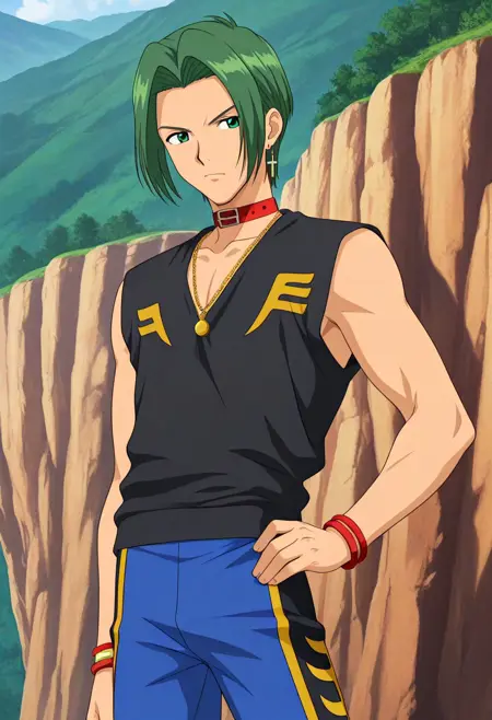 Solasido Sharpner, green hair, split bangs, green eyes, crucifix earring, red neck choker, necklace, blue amice, gray sleeveless shirt, red bracelets, blue pants