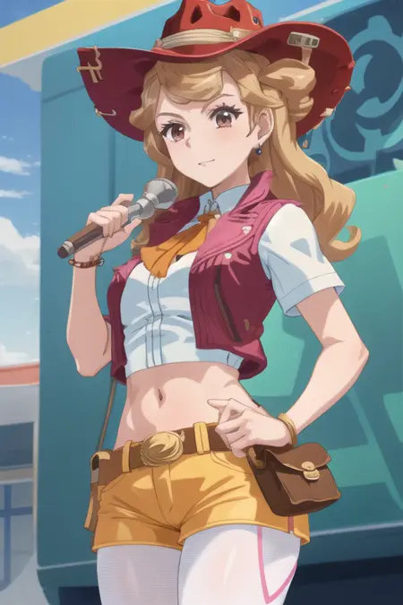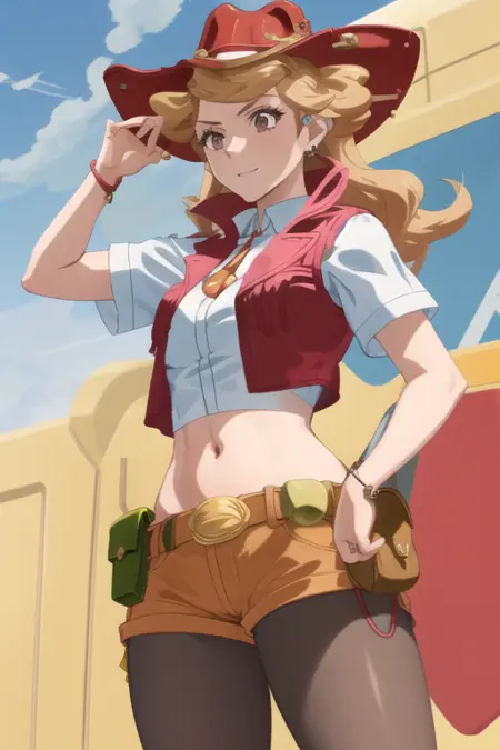 MelissaClaire, 1girl, solo, long hair, blonde hair, white shirt, navel, jewelry, brown eyes, short sleeves, pantyhose, short shorts, midriff, belt, maroon vest, crop top, pouch, fringe trim, cowboy hat,