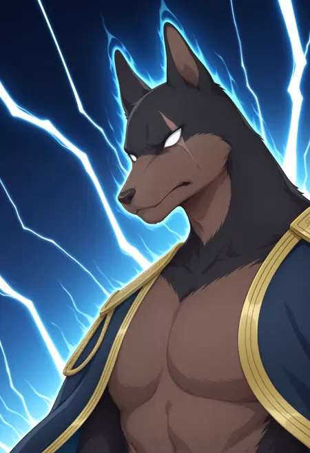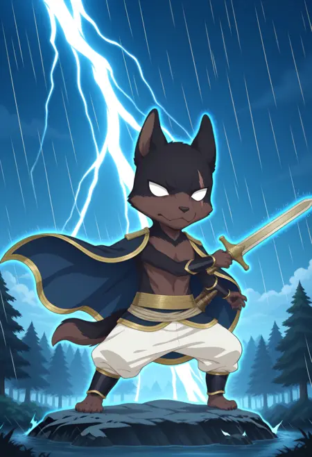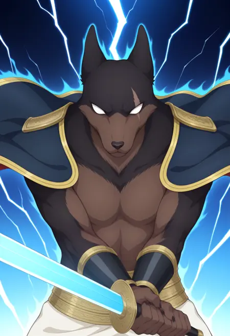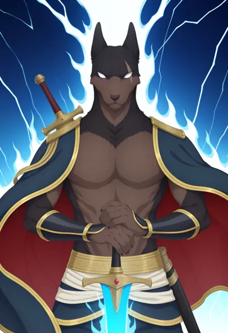 Keywords: gleipnir, dog boy, dark fur, no pupils, dog tail, scar, pants, gauntlets, clothes, cape, sword, weapon,