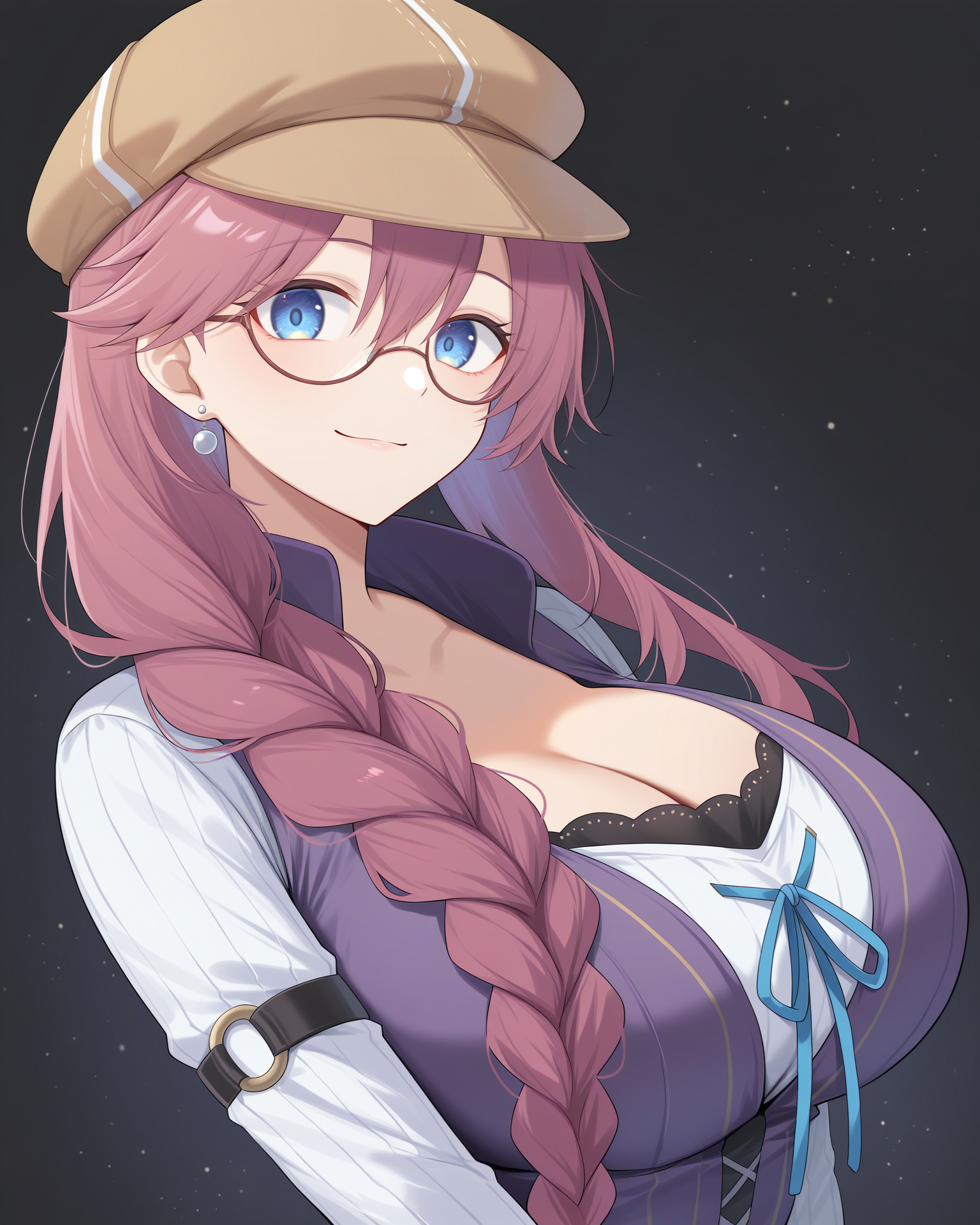 <lora:EmmaMillsteinCS4_Illustrious:1>, Emma Millstein, long hair, braid, purple hair, glasses, blue eyes, huge breasts, hat, purple dress, white shirt, blue ribbon, green skirt, black pantyhose, white boots,