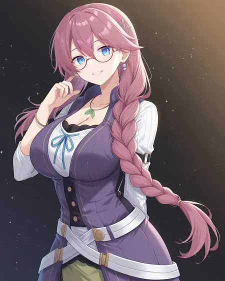 <lora:EmmaMillsteinCS4_Illustrious:1>, Emma Millstein, long hair, braid, purple hair, glasses, blue eyes, huge breasts, purple dress, white shirt, blue ribbon, green skirt, black pantyhose, white boots,