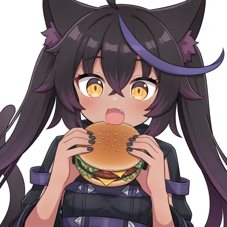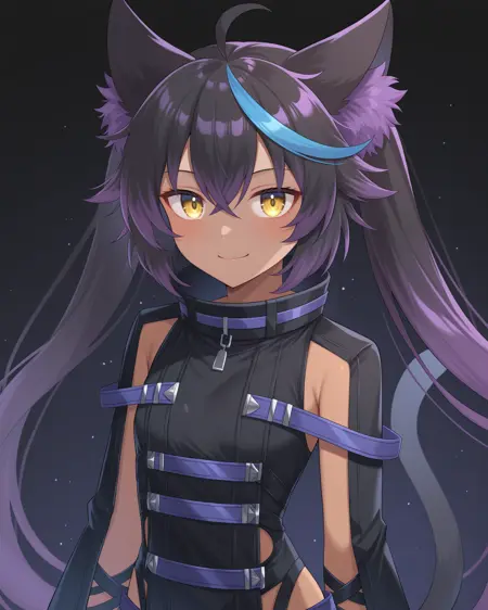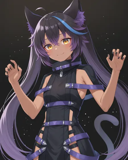 <lora:CelineMillstein_Illustrious:1>, Celine Millstein, 노란 눈, 검은 머리, 보라색 머리, 스트라이프 머리, ahoge, 긴 머리, 검은 고양이 귀, 트윈테일, 고양이 꼬리, 짙은 피부, 검은 피부를 가진 여자, 작은 가슴, 검은 손톱, 검은 드레스, 보라색 발,