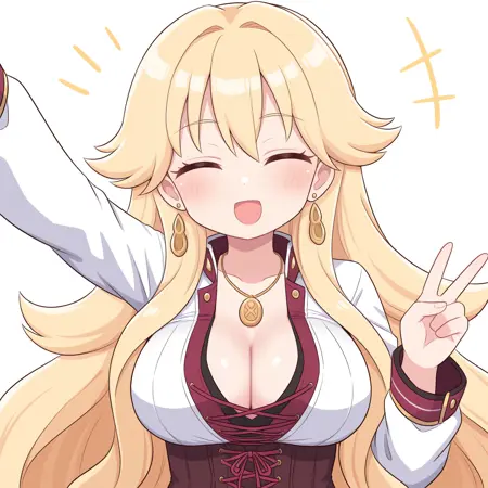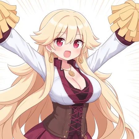 <lora:RoseliaMillsteinOlder_Illustrious:1>, Roselia Millstein, 금발, 매우 긴 머리, 붉은 눈, 큰 가슴, 목걸이, 귀걸이, 흰 셔츠, 흉부 노출, 긴 소매, 빨간 끈으로 단 정장, 긴 치마, 빨간 치마, 보라색 팬티스타킹, 갈색 부츠,