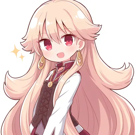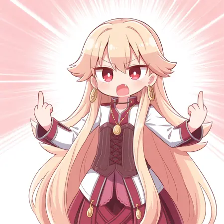 <lora:RoseliaMillsteinYounger_Illustrious:1>, Roselia Millstein, blonde hair, very long hair, red eyes, flat chest, necklace, earrings, white shirt, long sleeves, red laced corset, long skirt, red skirt, purple pantyhose, brown boots,