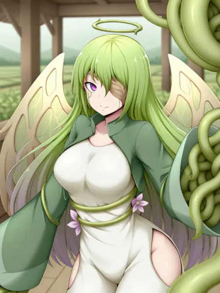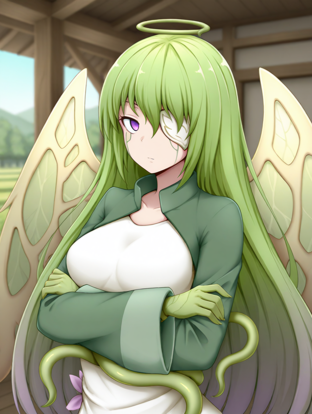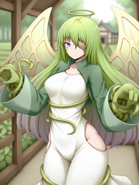 拉泰尔,绿发,长发,紫眼,植物女孩,天使翅膀,绿翼,黄翼,面部纹饰,(植物手臂),(植物手),(绿手),(触手手),眼罩,长白裙,服装剪裁,绿色夹克,宽袖,