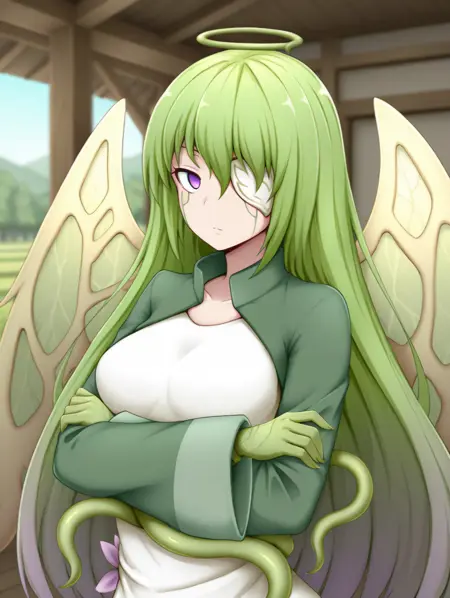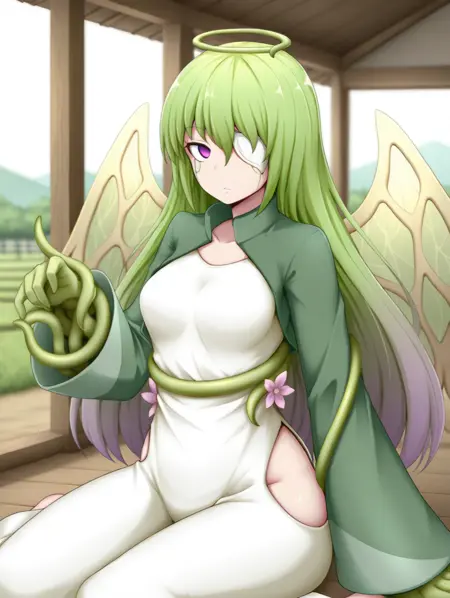 라텔, 녹색 머리, 긴 머리, 보라색 눈, 식물 소녀, 천사 날개, 녹색 날개, 노랑색 날개, 얼굴 문신, (식물 팔), (plant_hands), (녹색 손), (텐타클 손), 안대, 긴 흰 드레스, 옷 컷아웃, 녹색 재킷, 넓은 소매,