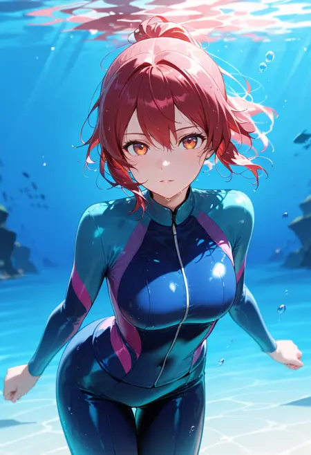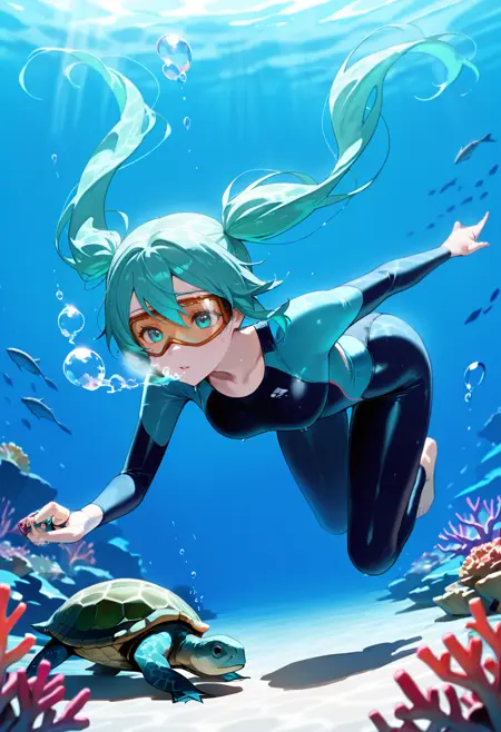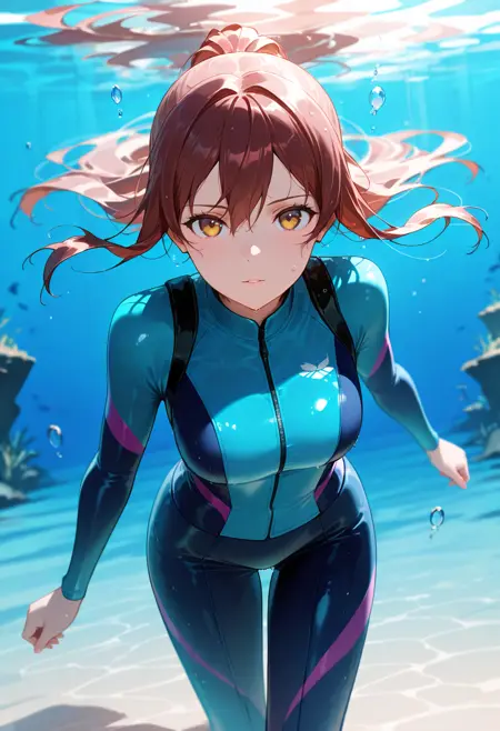 wetsuit, 1girl, purple eyes, ponytail, fish, underwater, long hair, blue hair, smile, bubble, open mouth, freediving, swimming, air bubble, solo, looking at viewer, :d, blush