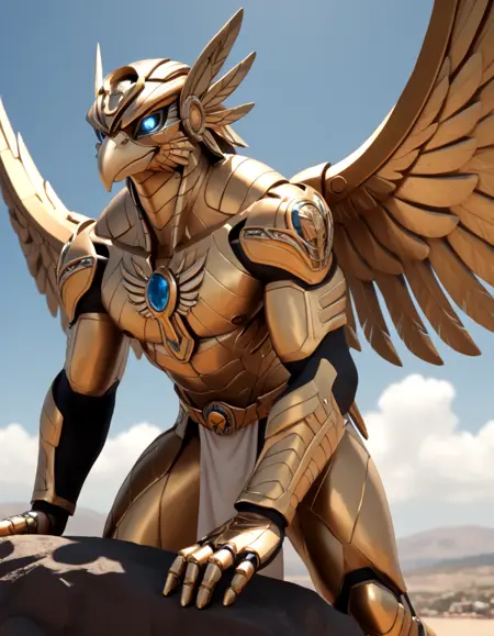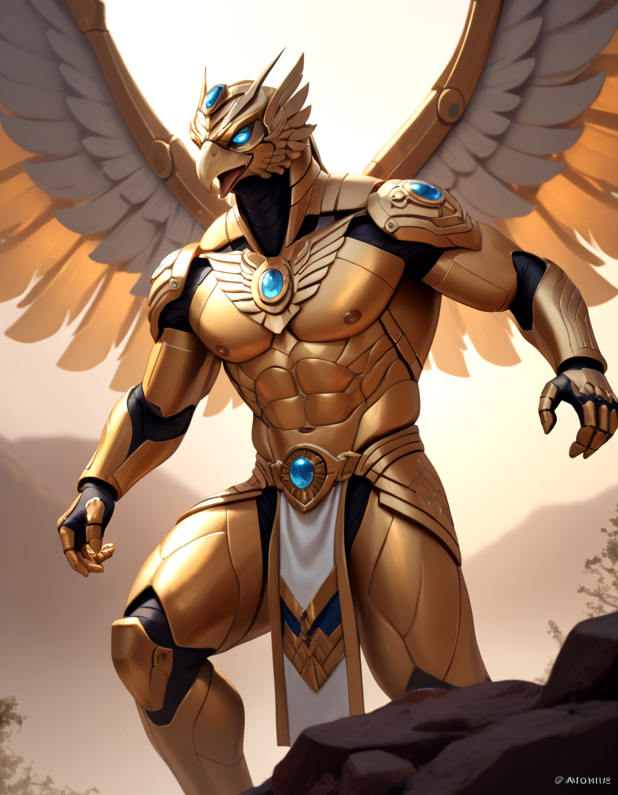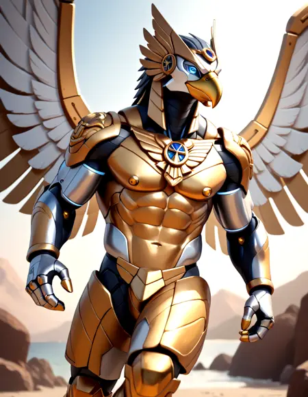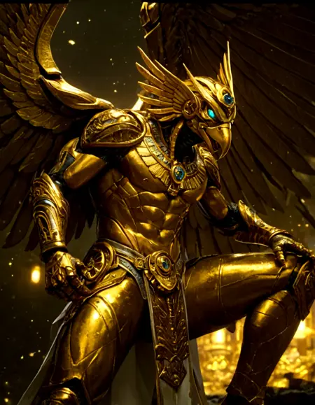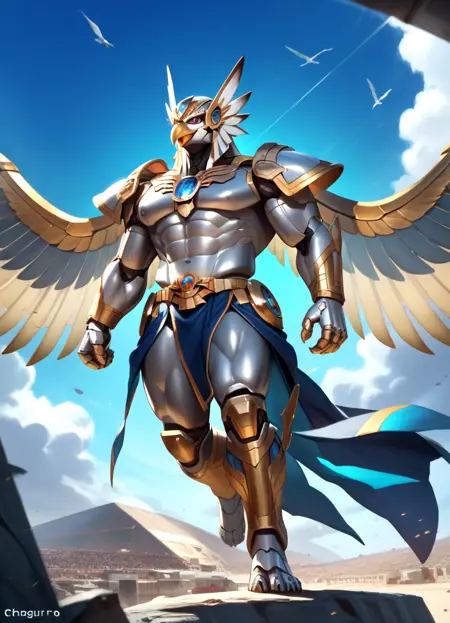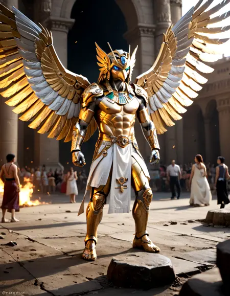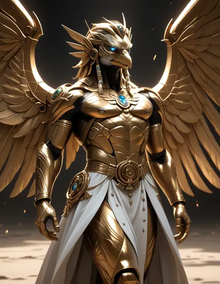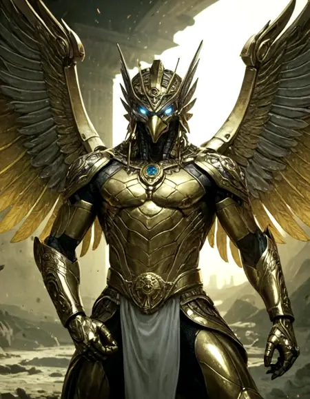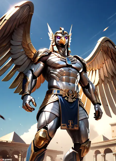 该Lora的提示词包括:horus、gold、silver、metal skin、golden silver metal skin、golden metal skin、silver metal skin、wings、muscular、armor、mech、mecha、robot、Egyptian、fighting、battle和dynamic action。训练该Lora时还使用了其他提示词,但我只列出了最常用的那些。我还使用了temple、city、palace、garden、destroyed temple、destroyed city、destroyed palace和monumental architecture。