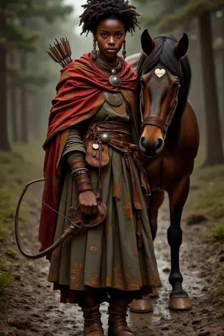 전신 초상, 서 있는 자세, 사진처럼 사실적인, 아프리카, 판타지, 여성, 화살촉, D&D 캐릭터, 전신 초상, 사진처럼 사실적인, 드레이프된 망토, 활, Greg Rutkowski 스타일, 허리띠, 주머니, 영화적인 초상, 뒤로 엮은 머리, 검은 피부, 디테일한, 곱슬머리, 말, 야생, 숲, 진흙 난로, 착용한 부츠, 스타일리시한 장신구, 부족 의복, 섬세한 의복 질감, 심도 있는 시야, 자연광, 우아한 부족 장신구, 귀걸이, 구슬 목걸이, 브로치 또는 펜던트, D&D, 판타지 슈퍼히어로, 로그"