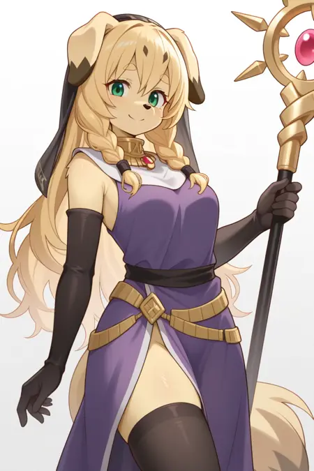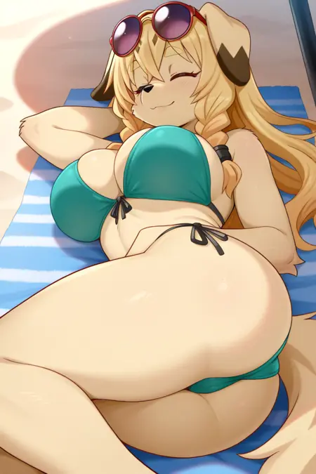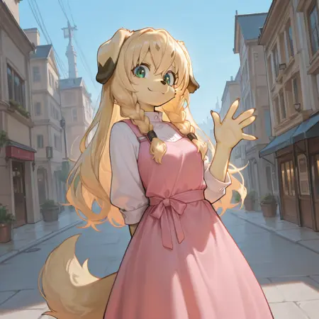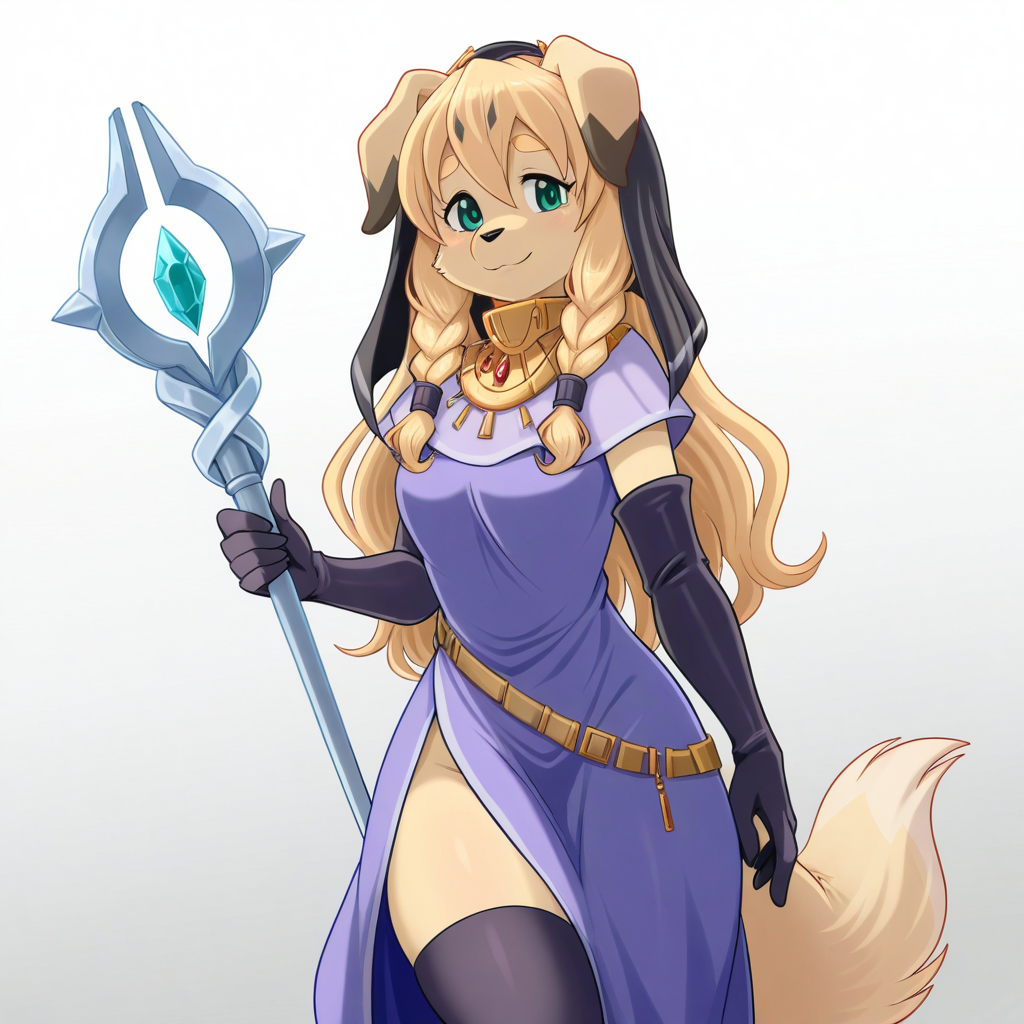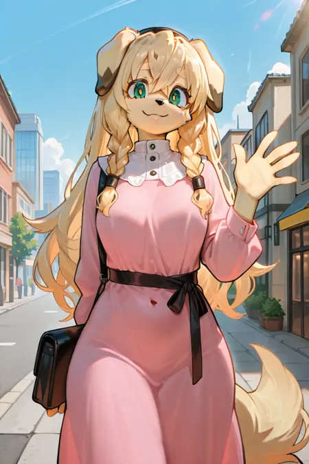 Tags: El4ine, anthro, furry female, dog girl, body fur, tan fur, blonde hair, long hair, twin braids, floppy ears, yellow thick eyebrows, black nose, snout, green eyes, tail