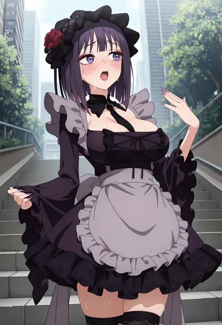 过膝袜, 围裙, 荷叶边, 黑色过膝袜, 黑色蕾丝头饰, 连衣裙, 宽袖, 链条牵引绳, 妆容, 黑色连衣裙, 口红, 领结, 可拆卸领子, 头饰, 花朵, 荷叶边连衣裙,