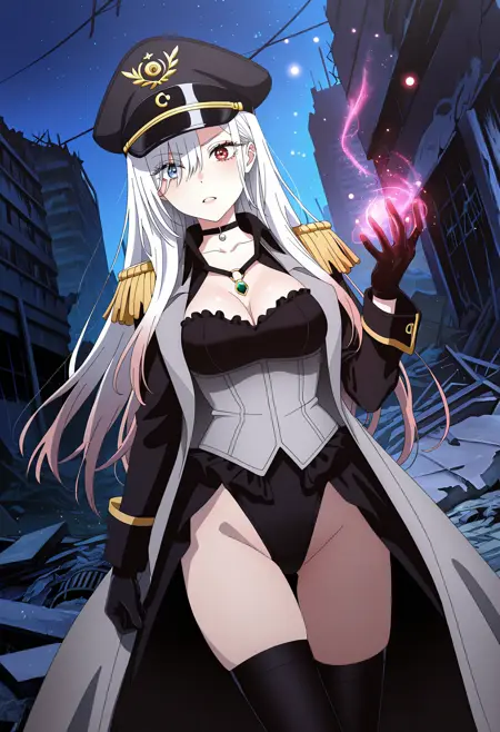胸部突出, 外套, 灰色束腰, 军帽, 尖顶帽, 灰色连衣裙, 黑色项圈, 胸前黑色宝石, 手套, 黑色过膝袜, 肩章, 连体衣, 灰色腰披,