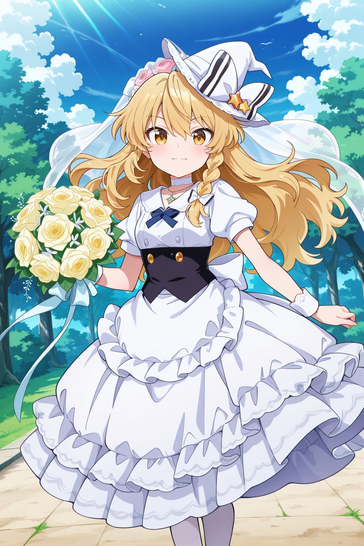 kirisame marisa, 1girl, solo, yellow eyes, blonde hair, long hair, single braid, small breasts, kirisame marisa \(pinnacle of white magic\), alternate costume, mini hat, white hat, hat bow, white bow, bridal veil, white choker, silver necklace, blue neck ribbon, fur trim, wedding dress, white dress, short sleeves, white wrist cuffs, black corset, back bow, white bow, frilled skirt, overskirt, waist apron, white pantyhose, white shoes, holding bouquet,