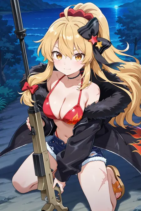 kirisame marisa, 1girl, solo, yellow eyes, blonde hair, ahoge, sidelocks, ponytail, long hair, large breasts, scar on shoulder, scar on leg,, kirisame marisa \(witch of scarlet dreams on vacation\), alternate costume, hair bow, black bow, torn bow, hair scrunchie, red scrunchie, black choker, fur-trimmed coat, black coat, off-shoulder coat, open coat, zipper, cleavage, red bikini, flame print, navel, clothing cutout, bikini under clothes, denim shorts, platform sandals, holding, anti-materiel rifle,