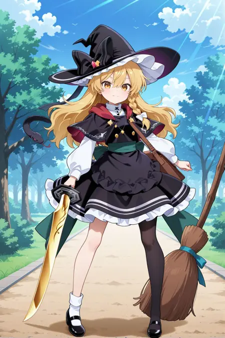 kirisame marisa, 1girl, solo, yellow eyes, blonde hair, long hair, single braid, small breasts, kirisame marisa \(draconic black magic knight\), alternate costume, witch hat, frilled hat, hat bow, black bow, necklace, two-tone capelet, red capelet, black capelet, necklace, white shirt, long sleeves, waist sash, green sash, waist apron, black apron, back bow, green bow, black skirt, frilled skirt, asymmetrical legwear, mismatched legwear, single pantyhose, black pantyhose, white socks, black shoes, brown bag, shoulder bag, broom, holding sword, golden sword, evil dragon \(touhou\), evil dragon, black snake,