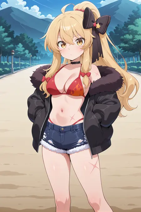 kirisame marisa, 1girl, solo, ahoge, blonde hair, yellow eyes, sidelocks, ponytail, straight hair, long hair, medium large breasts,, kirisame marisa \(witch of scarlet dreams on vacation\), hair bow, black bow, choker, clothing cutout, denim shorts, fur trim, black fur, black jacket, red bikini, flame print, navel, body scar,