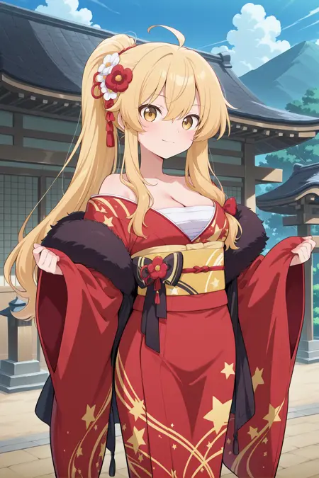 kirisame marisa, 1girl, solo, ahoge, blonde hair, yellow eyes, sidelocks, straight hair, ponytail, long hair, skinny, medium large breasts,, kirisame marisa \(witch of scarlet dreams\), alternate costume, alternate hairstyle, henohenomoheji, cleavage, hair flower, kanzashi, red flower, white flower, hair ornament, japanese clothes, off shoulder, chest sarashi, red kimono, print kimono, star print, long sleeves, wide sleeves, yellow obi, yellow obiage, black obijime, platform sandals,