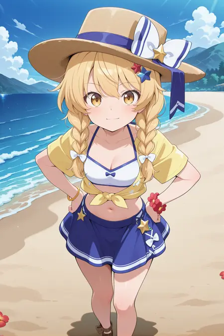 kirisame marisa, 1girl, solo, blonde hair, yellow eyes, twin braids, small breasts,, kirisame marisa \(magician on vacation\), alternate costume, alternate hairstyle, brown hat, boater hat, blue ribbon, white bow, star hair ornament, white bikini, tied shirt, yellow shirt, blue skirt, cleavage, navel, red flower bracelet, brown sandals,