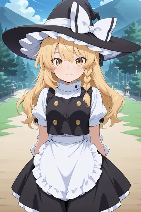 kirisame marisa, 1girl, solo, yellow eyes, blonde hair, long hair, single braid, small breasts,