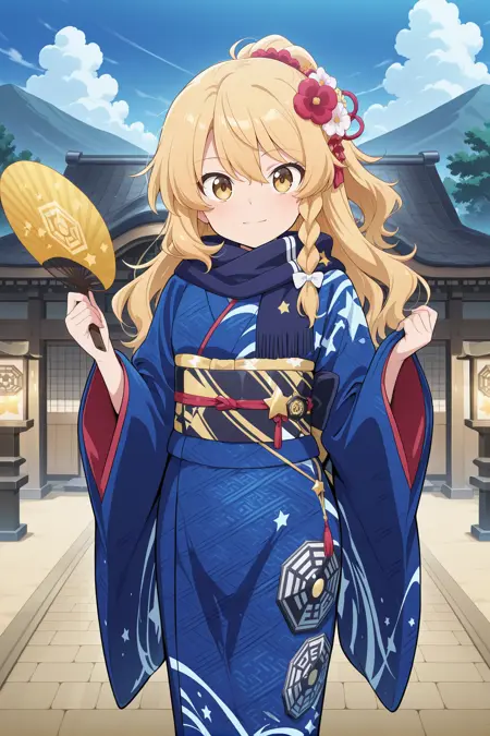 kirisame marisa, 1girl, solo, yellow eyes, blonde hair, single braid, ahoge, low-tied long hair,, kirisame marisa \(get-rich-quick magician\), alternate costume, hair bow, red bow, kanzashi, hair flower, pom pom hair ornament, blue scarf, two-sided cape, black cape, red cape, multicolored kimono, blue kimono, long sleeves, wide sleeves, frilled sleeves, print kimono, bagua print, red obi, furisode, holding fan, hand fan, white socks, black sandals,